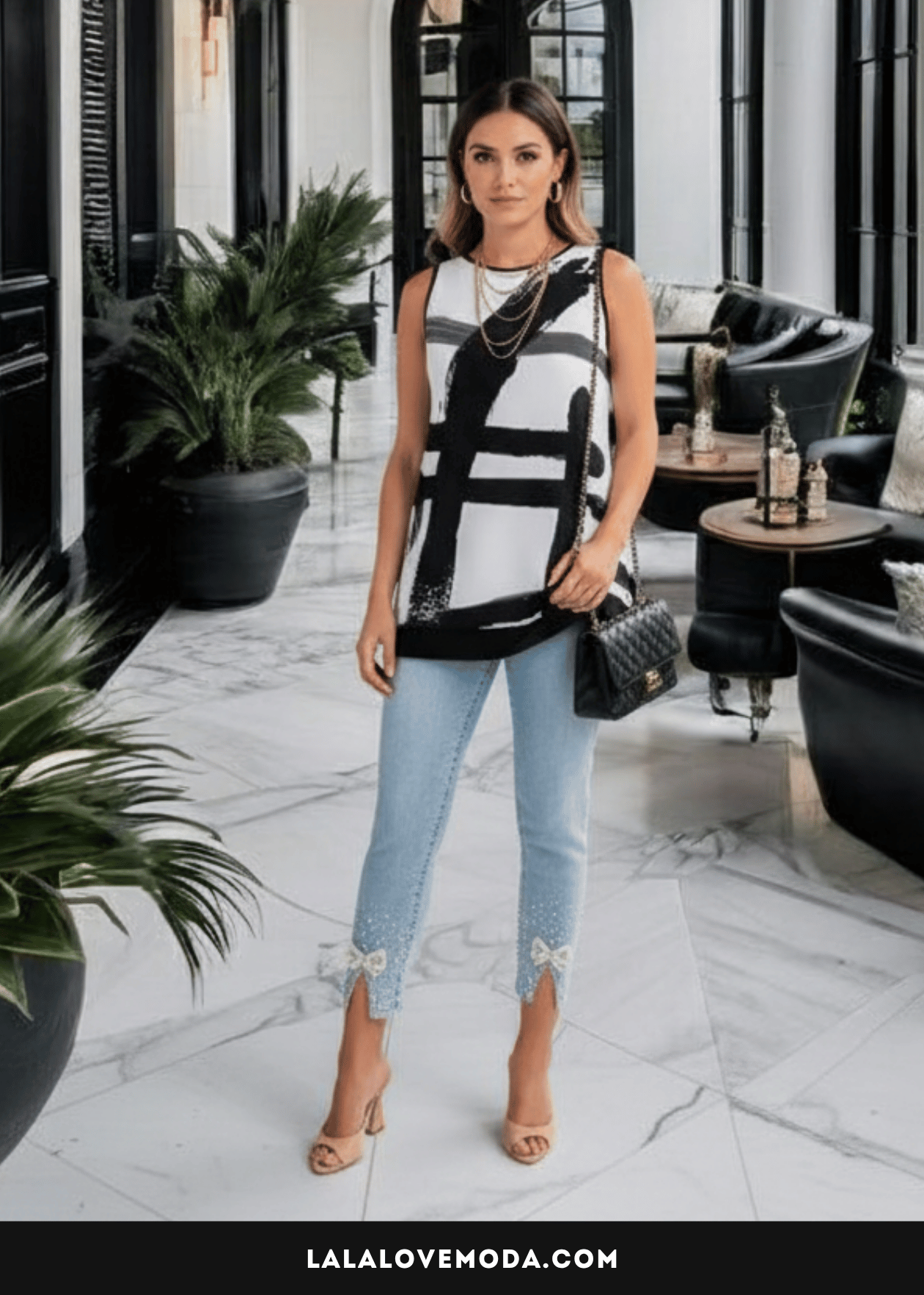 18. Black-and-White Brushed Stroke Sleeveless Top with Jeans