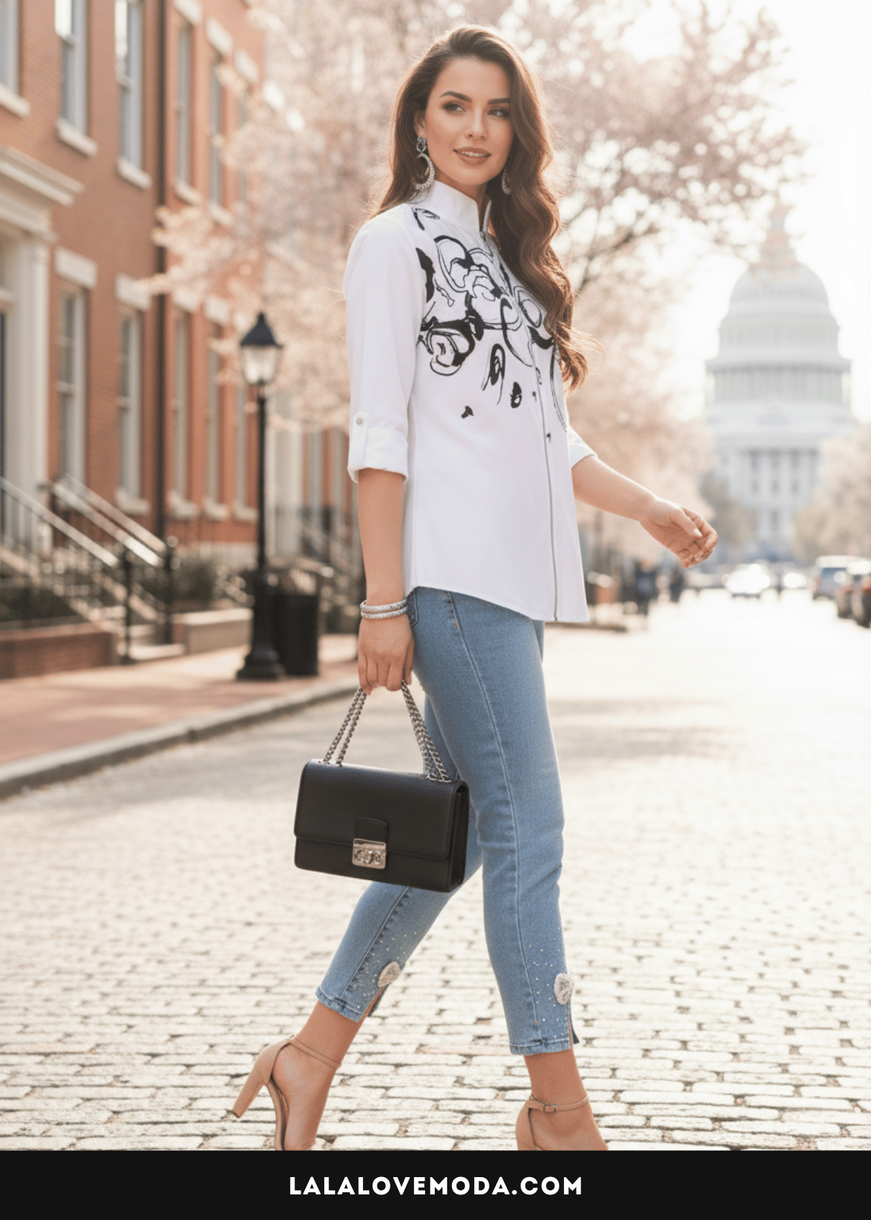 Sophisticated and feminine, this blouse is one of the most elegant tops for jeans for ladies. Pairing crisp white with embroidered denim creates a chic balance, making it ideal for semi-formal events or office outings.