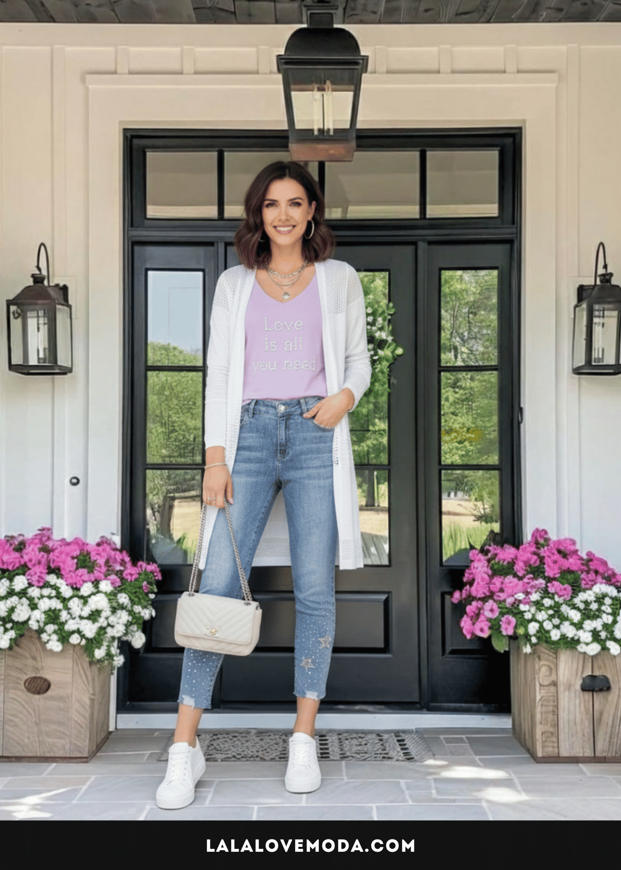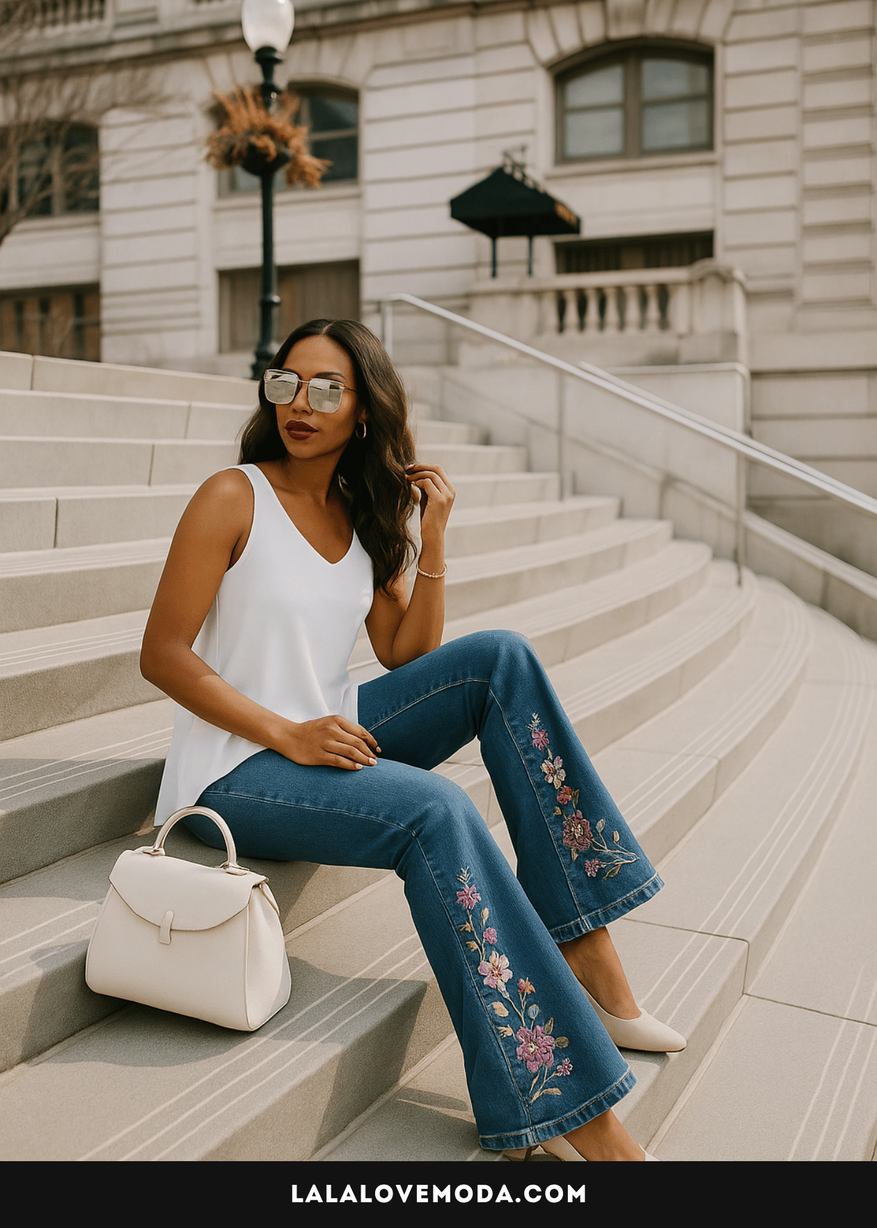 Romantic and chic, this pastel floral blouse is one of the sweetest tops for jeans for ladies. Paired with flared denim, it creates a breezy, feminine outfit perfect for brunches or garden parties.